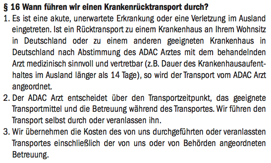 Wichtig ist hierbei noch die Anordnung des Transportes durch den ADAC. Zwar stimmt dieser sich mit dem behandelnden Arzt ab, jedoch entscheidet der Versicherer hier letztendlich über den Transport. Schaut man sich jedoch die Regelungen in anderen Tarifen der Privaten Krankenversicherung an, so können solche Formulierungen durchaus besser sein, da diese nicht von einer Anordnung durch den Versicherer abhängig gemacht werden können. So heißt es in den Bedingungen der Halleschen Krankenversicherung, Tarif NK: