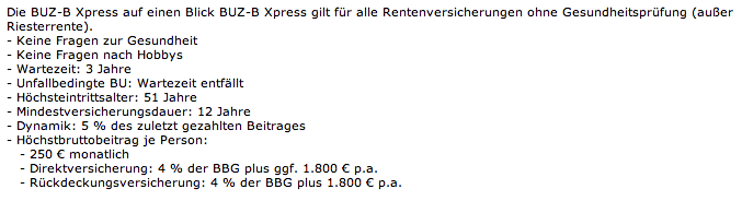 Den begehrten Schutz gibt es nämlich nicht allein, sondern nur wenn der Kunde gleichzeitig eine Rentenversicherung bei der Stuttgarter Lebensversicherung abschließt. Diese und nur diese wird dann nämlich beitragsfrei bei Eintritt einer Berufsunfähigkeit. Einfacher ausgedrückt, die maximale Rente die auf diesem Weg versicherbar ist, ist der Beitrag der Rentenversicherung. Dieser darf dann aber maximal 250 EUR monatlich betragen (bei Direktversicherungen und betrieblicher Altersvorsorge in Form von Rückdeckungsversicherungen gelten etwas andere Grenzen) und zudem darf der Kunde bei Abschluss nicht älter als 51 sein.