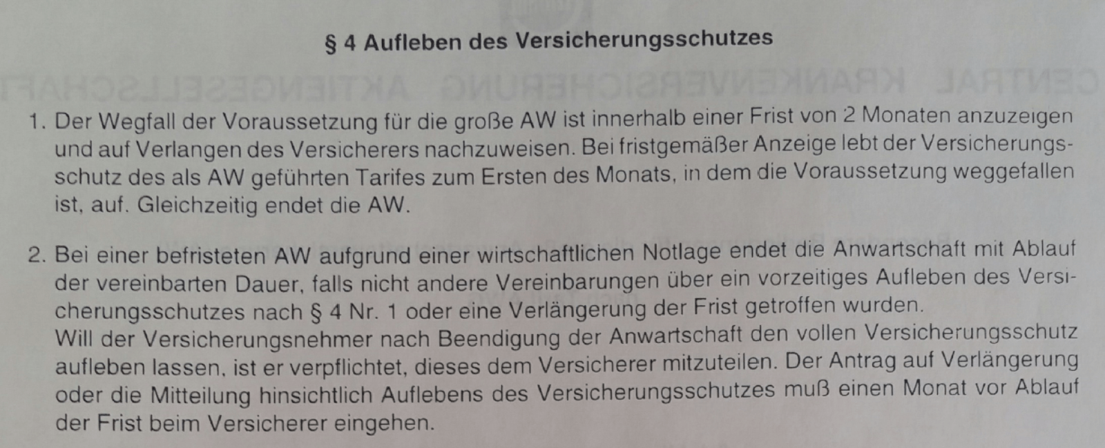 Hier ist genau so ein Fall eingetreten. Nach einigem Nachfragen und “Hin- und Herschreiben” kamen weitere Fakten und Umstände zu Tage. Es bestand damals schon ein Vertrag mit der Central Krankenversicherung und dieser wurde dann, nachdem Versicherungspflicht eingetreten war, auf “Anwartschaft gestellt”. Es wurden also weiterhin Beiträge gezahlt und monatlich pünktlich abgebucht. Aus dem damaligen Krankenversicherungsschutz wurde aufgrund der bestehenden GKV eine Anwartschaft. Grund war hier die Sicherung des Eintrittsalters und der Erhalt der gebildeten Altersrückstellungen. Eine solche große Anwartschaft ist nicht so günstig, die Beiträge sind problemlos vierstellig pro Jahr, sichern diese doch langfristig eine Rückkehr zu den alten Vertragskonditionen.