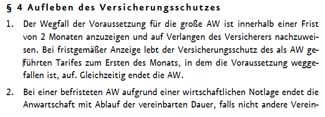 Doch nicht immer ist der Versicherer einfach nur böse und möchte den Kunden ärgern. Für eine solche Anwartschaft gelten Bedingungen, also das berühmte Kleingedruckte. Wir schauen uns einmal diese Bedingungen (hier im Stand 1/2011) genauer an, daran lassen sich gut die Regelungen erkennen.