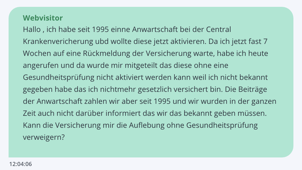 Die Kundin dachte, es handle sich um einen Fehler, schließlich habe sie genau darum doch die Anwartschaft die letzten 22 Jahre pünktlich bezahlt und nun soll sie dennoch eine neue Gesundheitsprüfung machen und sich dem Risiko eines Zuschlages oder der Ablehnung aussetzen? Das kann doch wohl nicht war sein, oder?