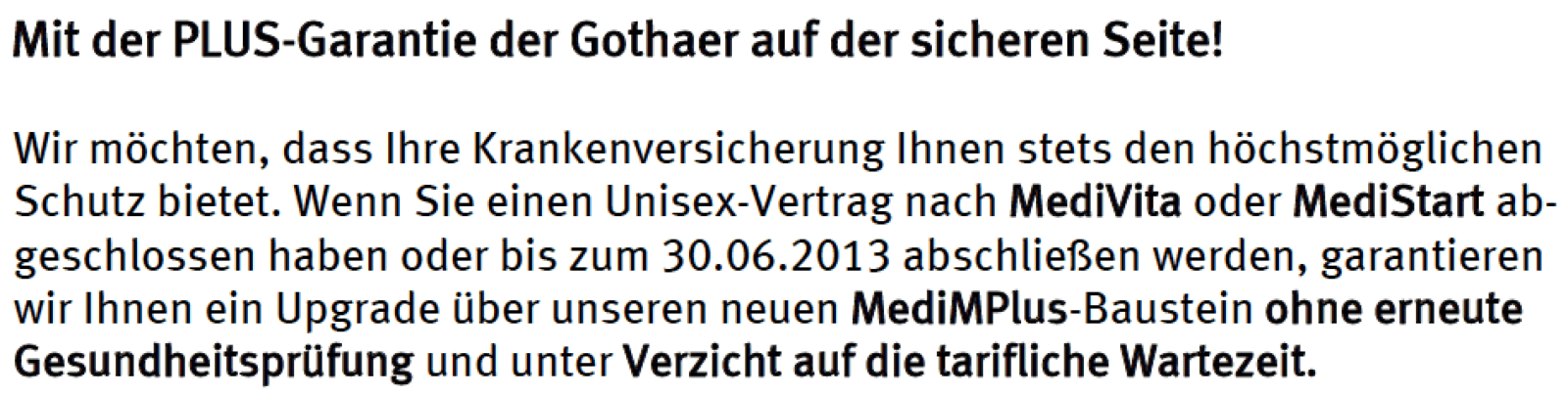 Versichern können sich alle vollversicherte Kunden in den Tarifen MediVita oder MediStart. Dabei spielt es keine Rolle, ob der Vertrag in der alten Bisex- oder der neuen Unisexwelt besteht. Bei einem Abschluss vor dem 30. 06. 2013 garantiert der Versicherer den Abschluss des Bausteins MediMPlus ohne Gesundheitsprüfung und ohne Anrechnung der Wartezeiten. (Für Altkunden entfällt die Gesundheitsprüfung ebenfalls und es gelten die bedingungsgemäßen Wartezeiten) In einer “Garantieerklärung” heisst es dazu: