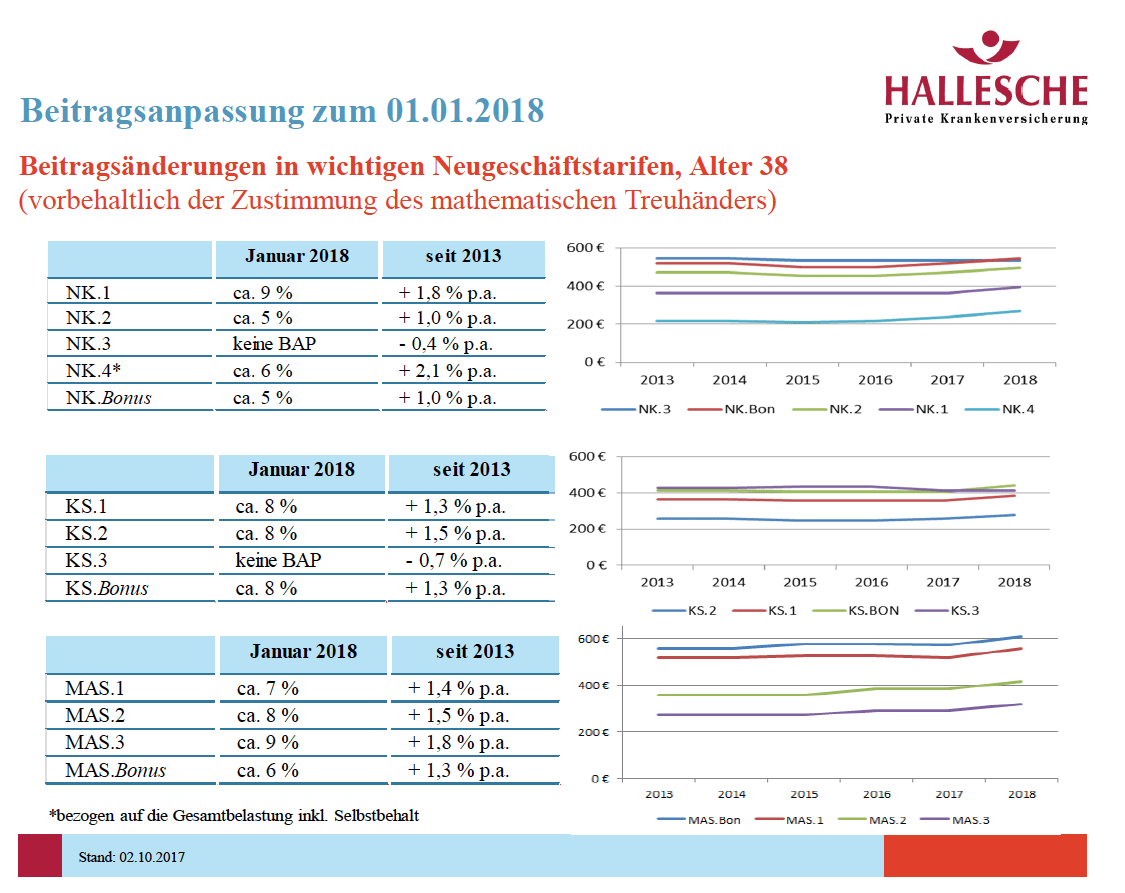 Dennoch ist es ein Anhaltspunkt und ein Blick in Richtung 2018, daher habe ich mich auch hier entschlossen die Infos so zu veröffentlichen. Bitte beachten Sie daher aber immer, es ist eine allgemeine Aussage, Aussagen zu speziellen Konstellationen kann ich Ihnen bei den Neugeschäftsbeiträgen ab sofort verbindlich nennen, da die Prämien 2018 veröffentlicht sind. Bei den Bestandstarifen hingegen, gibt es noch keine Aussage. Die Hallesche passt aber auch hier durchaus im Frühjahr und nicht zwingend zum 01.Januar an.