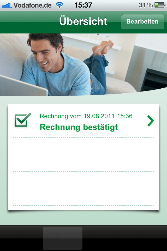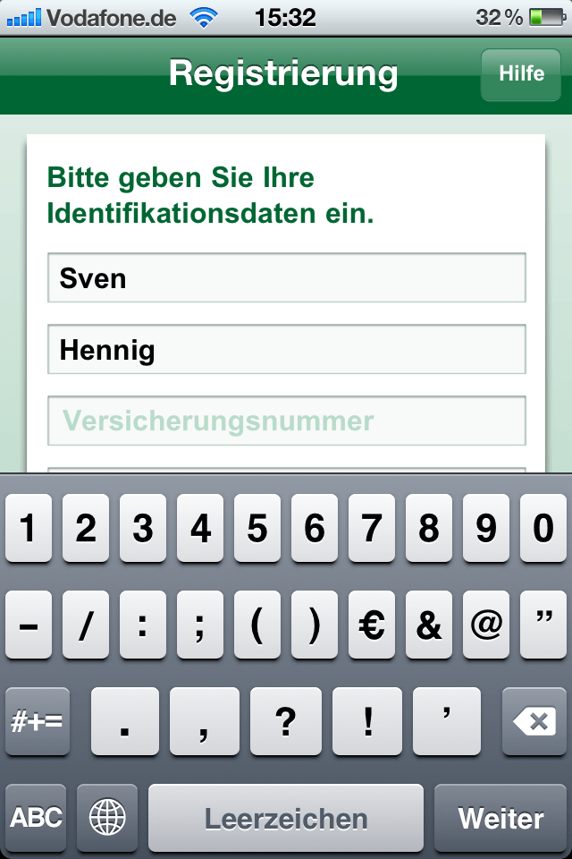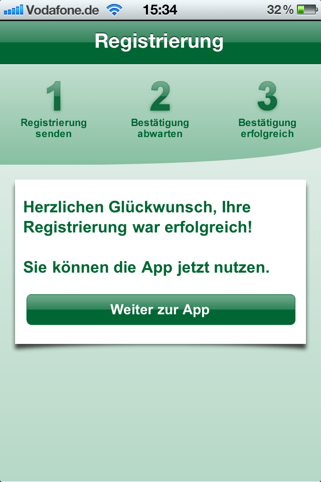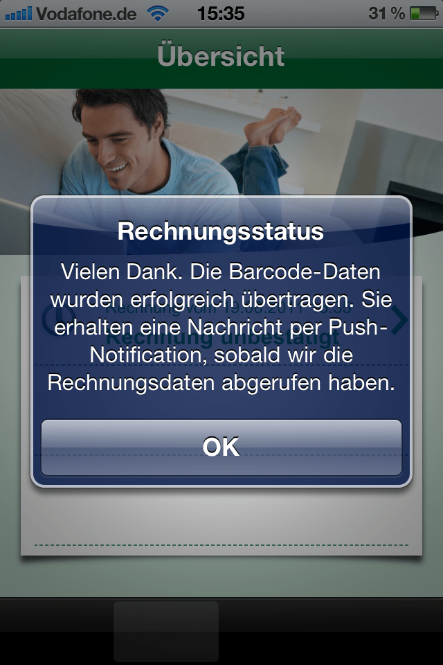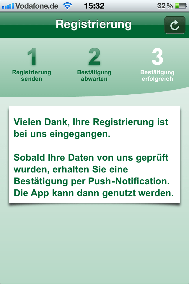 Zunächst startet der Kunde den Download der App aus dem AppStore (Downloadlink Rechnungsapp). Danach ist eine Registrierung nötig. Dabei werden neben dem Namen und Vornamen auch das Geburtsdatum und die Versicherungsnummer abgefragt. Wenige Minuten später erhält der Kunde die Freischaltungsinfo per Pushnachricht auf sein iPhone.