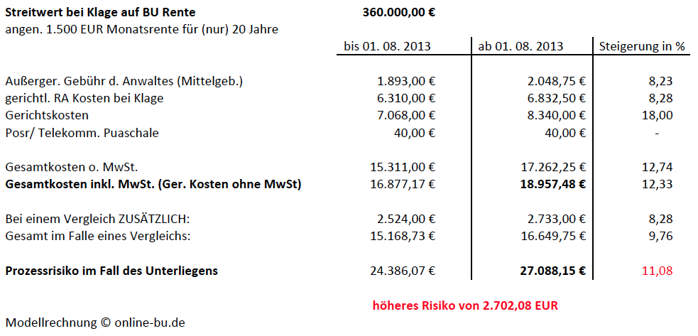 Hier recht gut zu erkennen, die Steigerung von knapp 800 EUR zum Einen, aber viel wichtiger das Kostenrisiko insgesamt. Ohne entsprechende Rechtsschutzversicherung von vielen kaum zu tragen. Im Falle der Klage auf Zahlung einer Berufsunfähigkeitsrente sieht es noch etwas “schlimmer” aus, denn hier ist der Streitwert deutlich höher. Ich habe bewusst nur mit einem Modell von 1.500 EUR monatlicher BU Rente und einer Zahldauer der Rente von 20 Jahren gerechnet. Dieses wird in vielen Fällen, gerade bei heute gut abgesicherten und gut verdienenden Menschen kaum ausreichen. Schon bei einer nur 500 EUR höheren Absicherung erhöht sich der Streitwert nochmals um 120.000 EUR.