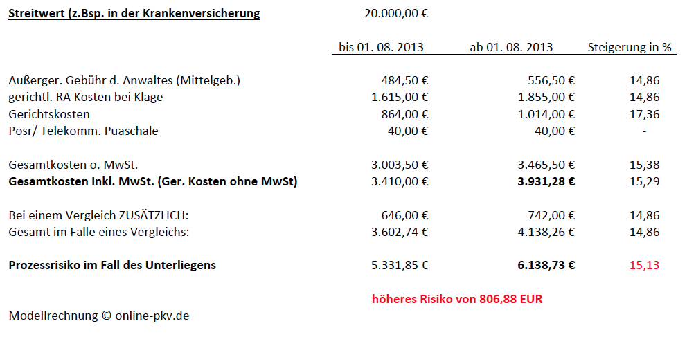 Um es etwas besser zu verstehen, hier etwas “Zahlenmaterial”. Im ersten Fall gehen wir von einem Streitwert von 20.000 EUR aus. Das kann in der Privaten Krankenversicherung der Streit um ein teures Hilfsmittel, längerfristige Medikamente oder eine Operation sein. Die Kosten sind hier im Vergleich von “vor- und nach” dem 01. 08. 2013 zu sehen und weisen auch die Kosten eines Vergleichs aus. Bei einer vergleichsweisen Einigung vor Gericht reduzieren sich die Gerichtskosten zwar, aber der Anwalt bekommt eine so genannte Vergleichsgebühr. Auch habe ich das gesamte Prozessrisiko mit aufgelistet, also den Betrag der im Falle eines Unterliegens zu zahlen ist, denn dann fallen neben eigenen Kosten auch die der Gegenseite an. Nicht berücksichtigt sind weitere Kosten für Gutachter, Zeugenauslagen und dergleichen.