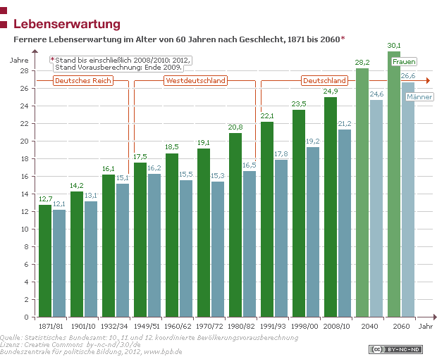 In der Sterbetafel 2008/2011 wurde ein neugeborener Junge statistisch 77 Jahre und 6 Monate alt. Ein neugeborenes Mädchen hatte demnach eine Lebenserwartung von 82 Jahren und 7 Monaten. Die aktuelle Sterbetafel, welche die Bezeichnung Periodensterbetafel 2009/2011 trägt, weist jedoch eine Lebenserwartung von 77 Jahren und 9 Monaten (für Jungen) und 82 Jahren und 9 Monaten für Mädchen auf. Daraus ergibt sich eine Erhöhung der Lebenserwartung um 3 bzw. 2 Monate. Auch wenn es auf den ersten Blick wenig erscheinen mag, so hat es doch Auswirkungen auf die Kalkulation der Versicherer. Neben der Lebenserwartung für Neugeborene hat sich auch die so genannte Restlebenserwartung der 65 jährigen (ferne Lebenserwartung) erhöht. So darf ein Mann im Alter von 65 Jahren heute darauf hoffen, statistisch noch 17 Jahre und 6 Monate zu leben, eine gleichaltrige Frau erwarten demnach noch 20 Jahre und 8 Monate. Auch hier sind Steigerungen von zwei bzw. einem Monat vollzogen worden. Auch in den vergangenen Jahren und in den Sterbetafeln zuvor, hat sich die Lebenserwartung bereits deutlich erhöht. Auch in Zukunft ist davon auszugehen, dass durch weiteren medizinischen Fortschritt und veränderte Lebensumstände ein höheres Lebensalter zu erwarten ist. Das stellt nicht nur die Versicherer vor einige Herausforderungen.
