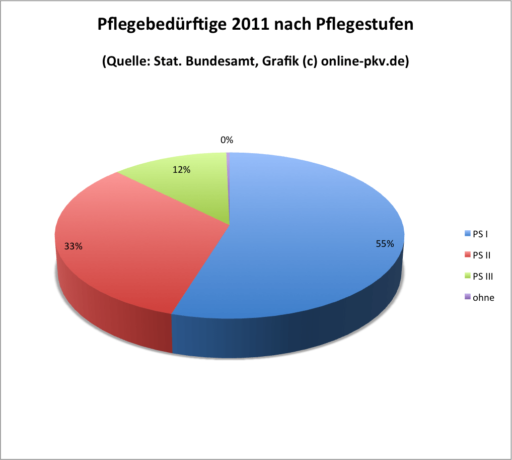 Dabei ist auch zu berücksichtigen, wie sich die Anzahl der Pflegebedürftigen verteilt. Den größten Anteil machen immer noch die Bedürftigen in der Pflegestufe 1 aus. Dieser Anteil hat sich von 53% in 2009 bis auf 55% in 2011 leicht erhöht, während die prozentuale Verteilung in den Stufen II und III nahezu unverändert blieb.