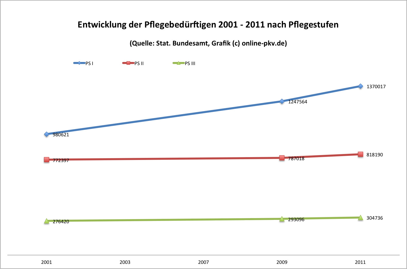 Hierbei ist der immer schnellere Anstieg zu beobachten. Stiegen in den Jahren 2001 bis 2009 die zu Pflegenden in der Stufe 1 von 980.621 um 266.943 Personen an, so war allein der Anstieg von 2009 bis 2011 schon 122.453 Personen. Daran ist unschwer die schnellere Entwicklung zu erkennen. Während die Medizin immer besser wird, die Menschen immer länger leben, so verursachen diese eben durch die Pflegebedürftigkeit auch deutlich mehr Kosten. Daher ist ein Anstieg von 9,82% in nur 2 Jahren meiner Meinung nach schon dramatisch.