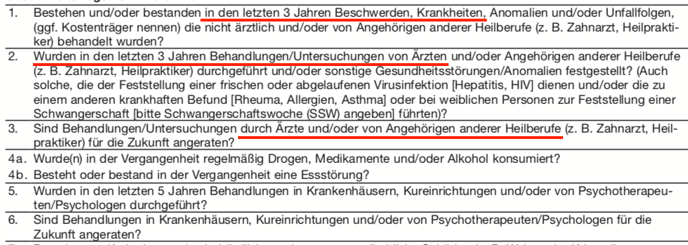 Was meinen Sie? Welche der Erkrankungen ist denn wie in die Antragsfragen zu schreiben? Dazu ist es wichtig einmal genau zu schauen, wie diese formuliert sind. Maßgebend sind bei unserer Kundin die Fragen 1, 2 und 3.