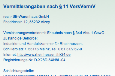 Auf der Unterseite “über uns” finden sich Angaben zum Versicherungsservice der Warenhauskette. Diese ist Vertreter der HanseMerkur und damit exklusiv für diese tätig. Dort ist die Registernummer angegeben und Hinweise zur Schlichtungsstelle. Es fehlen aber meiner Meinung nach eine Vielzahl von weiteren Angaben, welche für die gesetzlich vorgeschriebene Erstinformation von Bedeutung sind.