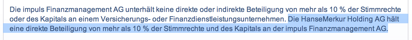 Also gut, Beteiligungen von Versicherern an Vertrieben sind nun nicht so ungewöhnlich, so ist die Deutsche Vermögensberatung (DVAG) in einem Versichererkonzern eingegliedert, auch die Beteiligungen zwischen SwissLife und dem AWD sind nicht unverborgen geblieben. Doch wie hoch ist denn dieses “von mehr als 10%” bei der Impuls? Dazu bringt uns ein Blick in den Bundesanzeiger weiter. Dort steht im Geschäftsbericht 2010 folgendes: