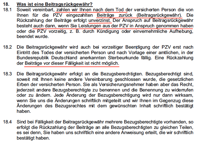 Durch das Modell der Rückerstattung wird also, bei Tod der versicherten Person, die Summe der Beiträge ausgezahlt. Klar gibt es keine Zinsen, aber die Beiträge fließen zurück. Doch soviel zur Vorgeschichte, der Versicherer hat es damals so angeboten und ich es geneinsam mit meiner Kundin so abgeschlossen. Es besteht also ein Vertrag welcher von uns als Makler vermittelt und betreut wird und regelmäßig bezahlt wird.